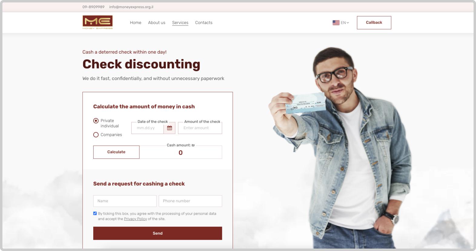 The third online calculator was created for the service “Check Discounting”. With this feature, the client can calculate the check amount, taking into account variable data — the date of the check, commission, rates for individuals/companies.
